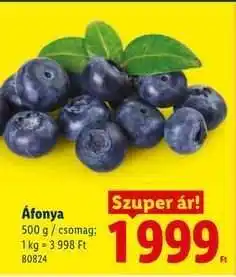 Lidl Áfonya ajánlatÁfonya 250 gLidl1 199,00 Ft16 április 202622 április 2026