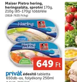 | Maiser Pietro hering 170 g, 210 g | PRIVÁT | 649,00 Ft | 05 március 2026 | 11 március 2026 | |||