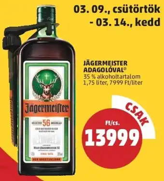 | Jägermeister Adagolóval 35% 1,75 l | PENNY | 13 999,00 Ft | 09 március 2023 | 14 március 2023 | |||