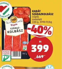 | KARÁT SZÁRAZKOLBÁSZ 100 g | PENNY | 669,00 Ft | 399,00 Ft | -40% | 16 április 2026 | 22 április 2026 | |