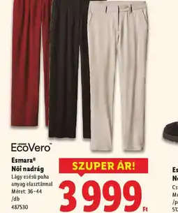 Lidl Esmera Női elegáns nadrág ajánlatEsmera Női elegáns nadrág 1 dbLidl3 999,00 FtSzuper ár!10 április 202515 április 2025