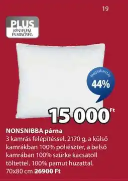 Ezen a héten több Párna akció is érvényes, többek között a(z) JYSK-nál és más nagy áruházláncoknál. Találsz 1+1 ajánlatokat, 25% kedvezményt vagy extra alacsony árakat Párna, NONSNIBBA párna és Gyros párna termékekre. Használd a szűrőket, hogy csomagolás típusa, kiszerelés vagy kedvenc bolt szerint szűrj.