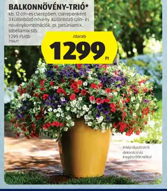BALKONNÖVÉNY-TRI jelenleg akcióban van a(z) ALDI-nál, érvényes 30-04-2026 és 06-05-2026 között. Nézze meg az aktuális kedvezményeket, és rendelje meg a(z) BALKONNÖVÉNY-TRI terméket online a ALDI weboldalán, vagy vásárolja meg előnyös áron.
