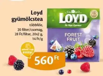 Ez az akciós ajánlat több különféle üzletben is elérhető, tekintsd meg az összes terméket, hogy a legjobb Loyd gyümölcstea ajánlatban részesülj. Ha szeretnéd megtudni, más üzletekben ez a termék nagyobb leárazással vásárolható-e meg, nézd meg a(z) 'Szupermarket' kategóriát. Ezek az ajánlatok szintén érdekelhetnek: Loyd Tea Taste of The World teaválogatás, LOYD TEA TASTE OF THE WORLD TEAVÁLOGATÁS, 20 FILTER, és ajánlat 3.