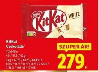A(z) Lidl termékek széles választékát kínálja, a(z) KitKat Csokoládé-t leszámítva. Nézd meg a heti Lidl akciós újság ajánlatát, hogy a legjobb ajánlatokról és promóciókról ne maradj le. A(z) KitKat Csokoládé-t leszámítva több ajánlatot is találsz: KitKat csokoládényúl, KitKat csokoládétojás, és KitKat.