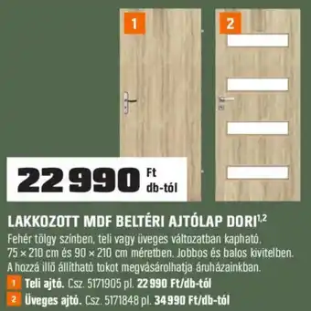 Az akciós Lakkozott MDF beltéri ajtólap dori ára megtalálható az oldal tetején, az ajánlat időtartamával együtt. Az árat megnézheted a jelenlegi OBI akciós újság kínálatában, vagy a(z) OBI weboldalán. A promóciós ajánlatok biztosítanak arról, hogy a(z) OBI termékeit a legolcsóbb áron szerezhesd be.