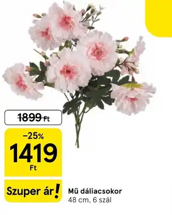 Az akciós Mű dáliacsokor ára megtalálható az oldal tetején, az ajánlat időtartamával együtt. Az árat megnézheted a jelenlegi Tesco akciós újság kínálatában, vagy a(z) Tesco weboldalán. A promóciós ajánlatok biztosítanak arról, hogy a(z) Tesco termékeit a legolcsóbb áron szerezhesd be.
